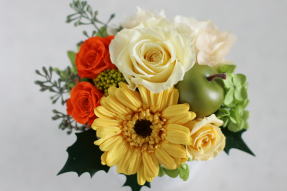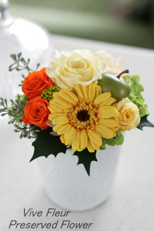 *リンゴ以外、グリーン類も含め全て生花をプリザーブ(保存)加工されたものを使用しております