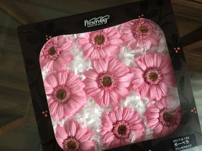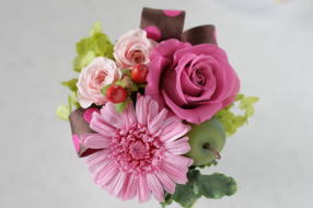 ローズ、ガーベラ、ヒペリカム、アジサイ、ピトスポラム、リンゴ、リボン