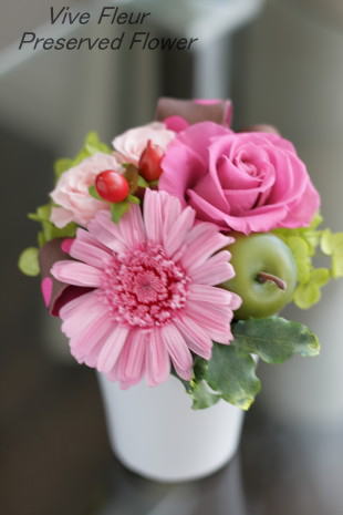 *ヒペリカム、リンゴ以外は、グリーン類も含め全て生花をプリザーブ(保存)加工されたものを使用しております。