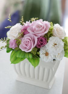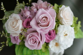 ローズ、マリアンヌ、アジサイ、ルスカス、ミスティ、ウィローユーカリ、リボン