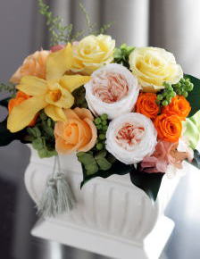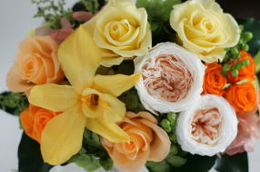 ローズ、オールドローズ、デンドロビウム、ペッパーベリー、アジサイ、ストーベ、アイビー、リンゴ、タッセル、リボン