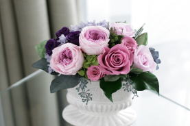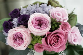 オールドローズ、ローズ、アジサイ、バーゼリア、アイビー、実付きユーカリ、ブーゲンビリア、リボン