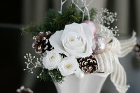 ローズ、松笠(ドライ)、ガラスボール、小枝、カスミソウ、ヒムロスギ、パール、リボン