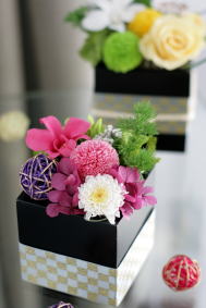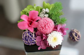 ピンポンマム、小菊、デンファイレ、コットンフィリカ、アジサイ、ミリオクラダス、ラタボール、リボン