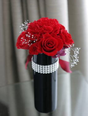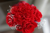 ローズ、カーネーション、リンゴ、カスミソウ、アジサイ、リボン