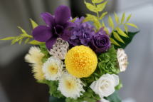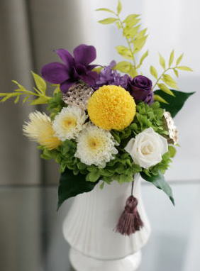 ローズ、ピンポンマム、小菊、デンファレ、ハス(ドライ)、デイジー(ドライ)、アジサイ、アイビー、ラスカス、タッセル、リボン