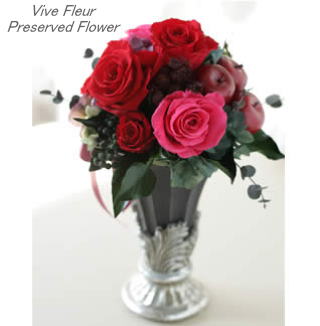 深紅のローズがいっぱいのとてもエレガントなアレンジ。 高級感溢れるクラシカルな花器で、ワンランク上のギフトに!