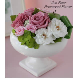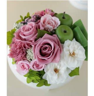 コンポートの中に、甘く優しいピンクのローズと真っ白なマリアンヌやリンゴなど沢山盛って!華やかでエレガントなアレンジです。 丸っこいコンポートの花器もとてもキュート!! 新築のお祝いなどに最適です♪