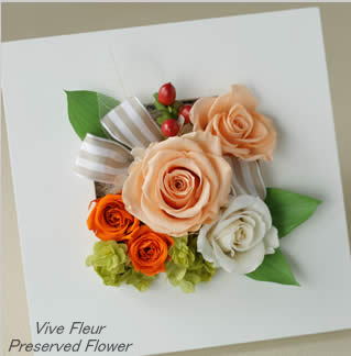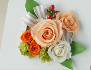 スタンドにも壁掛けにもできるフレームアレンジ。 純白のフレームに、オレンジ系ローズとおしゃれなフランス製のリボンをアクセントにして、やさしく華やいだ印象に! *黒のフレームにも変更できます。