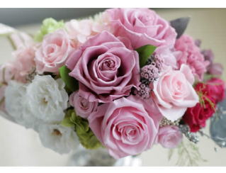 ローズ、マリアンヌ、カーネーション、コットンフィリカ、ライスフラワー、実付ユーカリ、ルスカス、アジサイ、アスパラ、リボン