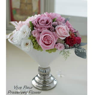 シルバーの脚が格調高い花器に、ピンクのローズとキュートな白いマリアンヌを一緒にあしらって。 女性なら誰でもうっとりする優しさに溢れたアレンジです。 新築や結婚のお祝い、大切な方への贈り物にいかがですか!