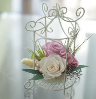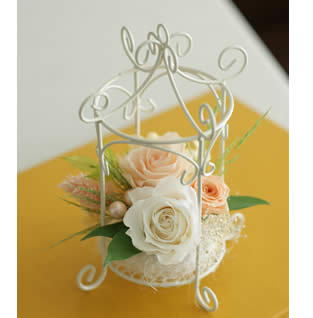 ワイヤー製のベースに、白とピーチ色(ピンク色)のローズがとても優しい雰囲気のアレンジ。 エレガントなベースの中のキュートなお花は、見ているだけで幸せな気分になれますよ♪♪ *ローズの色、ピーチまたはピンクいずれかご指定ください。