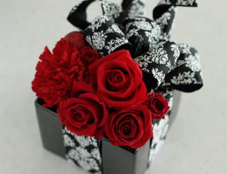 スクエアな花器にダマスク柄のリボンを大胆に使い、深紅のローズとの取り合わせがモダンなアレンジ。 ラグジュアリー感のあるアレンジはおしゃれな方への贈り物にいかがですか!