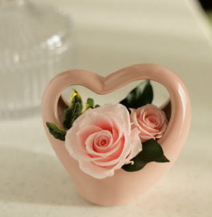 ハートのバスケット型に合わせた、ピンクのローズがキュートなアレンジ♪♪ 女性のプレゼントにいかがですか!