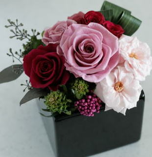 大人ピンクのローズの中に可愛いマリアンヌが入った、落ち着きのあるエレガントなアレンジ。 新築のお祝いなどにいかがですがか! *黒の花器入荷しました。