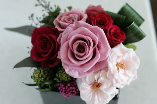 ローズ、マリアンヌ、サリグナム、実付ユーカリ、ライスフラワー、アジサイ、リボンリーフ