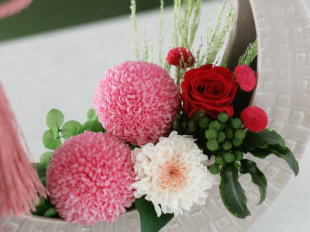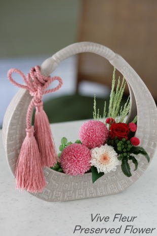 バスケット型の花器に桃色のピンポンマムや小菊をあしらって、春らしい和モダンなアレンジ。 タッセルが高級感を醸し出しています♪ *淡いモカ色の花器は完売しました。写真右下の白い花器でのお作りとなりますのでご了承ください。。