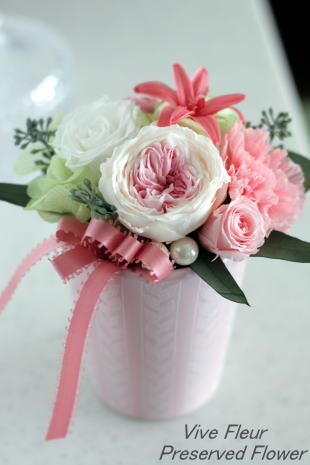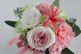 オールドローズ、ローズ、カーネーション、チューベローズ、ソーラーローズ(ドライ)、アジサイ、実付きユーカリ、パール(オーナメント)、リボン *ソーラーローズ以外、グリーン類も含め全て生花をプリザーブ(保存)加工されたものを使用しております |